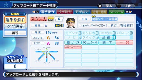 2017年成績11勝7敗防御率2.98 投げる哲学者。昨年は投手陣を引っ張ったが今年は投手陣の足を引っ張っている まあ来年には復活するでしょ、多分 [査定について] デフォルトだとノビB。しかしまあ緩急の得能があるのでCにして球持ちを追加 また、長打を割と打…