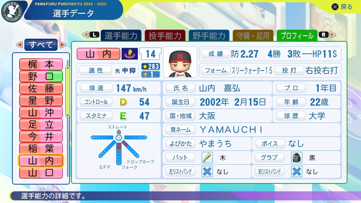 なお、1軍での登板機会は全てリリーフだった山内だが2軍の初登板時は先発で完投も記録している。
